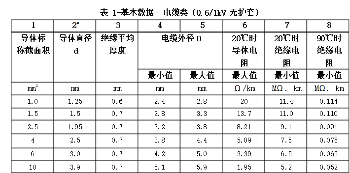 6.7.1無護套電纜(表1和表2-0.6/1kV和1.8/3Kv)
