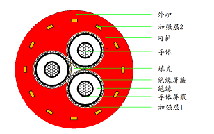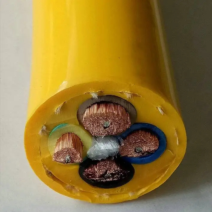 電纜的結(jié)構(gòu)形式是3+1,三根動力線和一根黃綠接地線,抗拉鋼絲加在導(dǎo)體的中間,黃綠線和另外兩根抗拉彈性體條置于3芯動力線的側(cè)邊,此外也可以選用鋼絲外置的抗拉形式,此種特殊電纜的結(jié)構(gòu)常用的有3+1,3+2,3+3,4+6等等,具體的可以按照要求加工定制。電纜結(jié)構(gòu)導(dǎo)體:耐折彎無氧銅絲軟導(dǎo)體導(dǎo)體類型:高純度無氧裸銅絲絕緣:特殊丁睛柔軟絕緣顏色:芯線顏色紅綠黃藍(lán)分色區(qū)分內(nèi)襯層:特殊無紡布包裹緩沖?估褐虚g高強(qiáng)度鋼絲填充抗拉填充加強(qiáng):多股黃麻繩填充(可選)、鋼絲、進(jìn)口凱夫拉防彈絲可選護(hù)套:高柔性高抗撕裂彈性體外保護(hù)套起重機(jī)卷筒電纜線特性:纜芯之間加有黃麻強(qiáng)承載,可以選擇鋼絲抗拉或者進(jìn)口凱夫拉防彈絲纖維編織抗拉。芯線與護(hù)套間還包有一層無紡布緩沖,在超高長度情況下還有進(jìn)口紡倫紗可供選擇。產(chǎn)品具有高度的柔性、抗拉、抗撕裂、抗扭轉(zhuǎn)、抗震動、耐磨、耐刻痕、耐彎曲、防水、耐油、耐溶劑腐蝕、耐酸堿、防紫外線照射